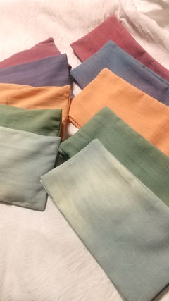 こちらで紹介している作品は色の楽しさを知っていただく機会のひとつとして、染料をあれこれ使わずに基本的な赤・青・黄の3色から染めました